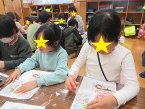 描いた絵に色を塗る際、お父さんとお母さんの好きな色を思い浮かべながら